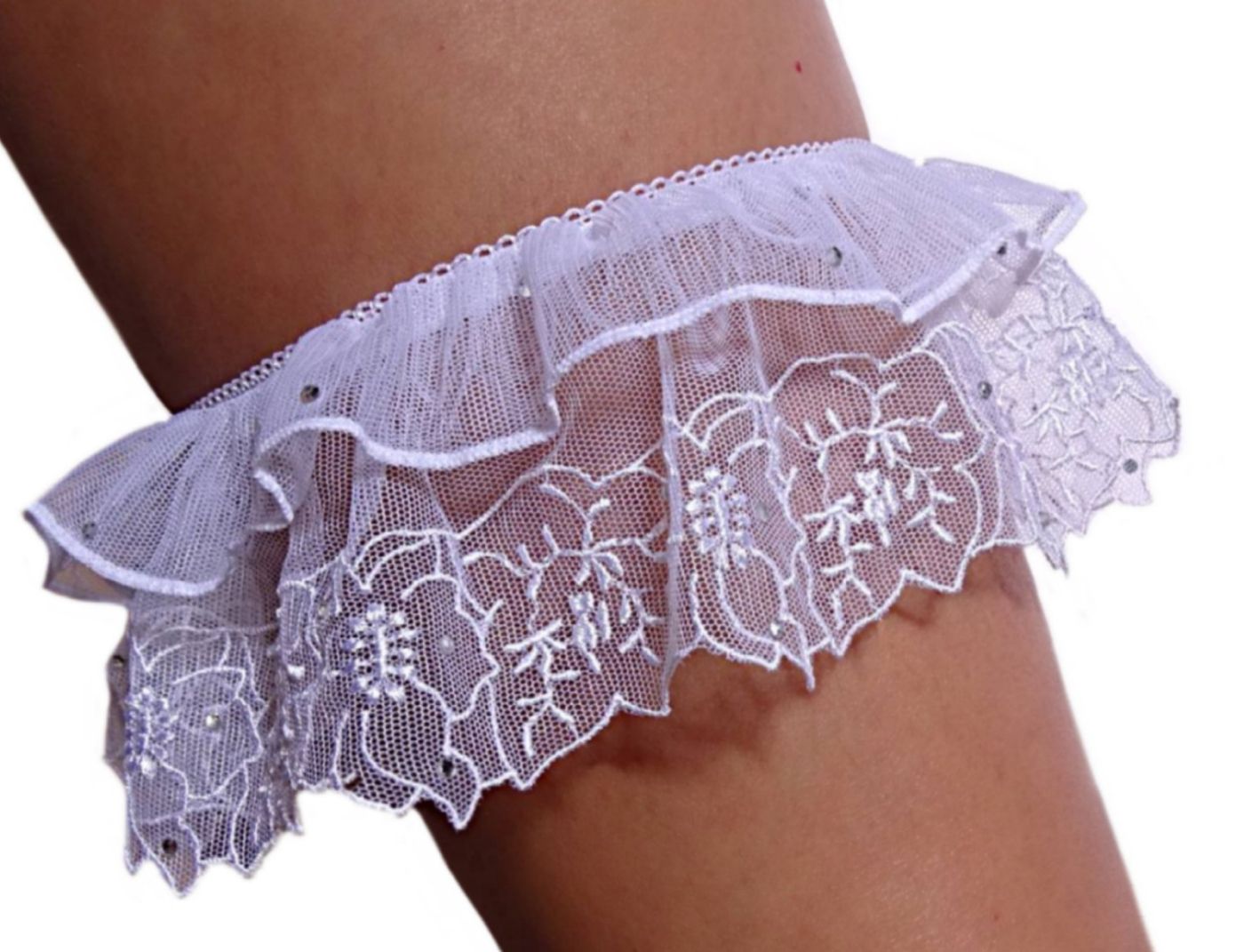 The garter is hand-decorated with white stones that emphasize the beauty of the lace.