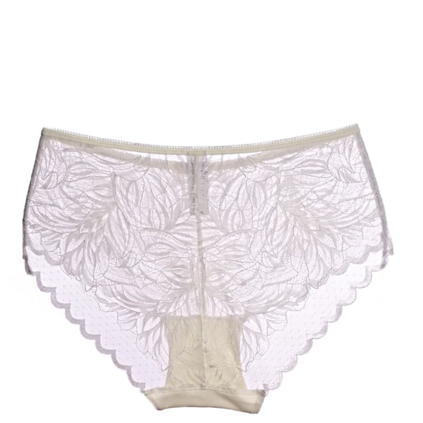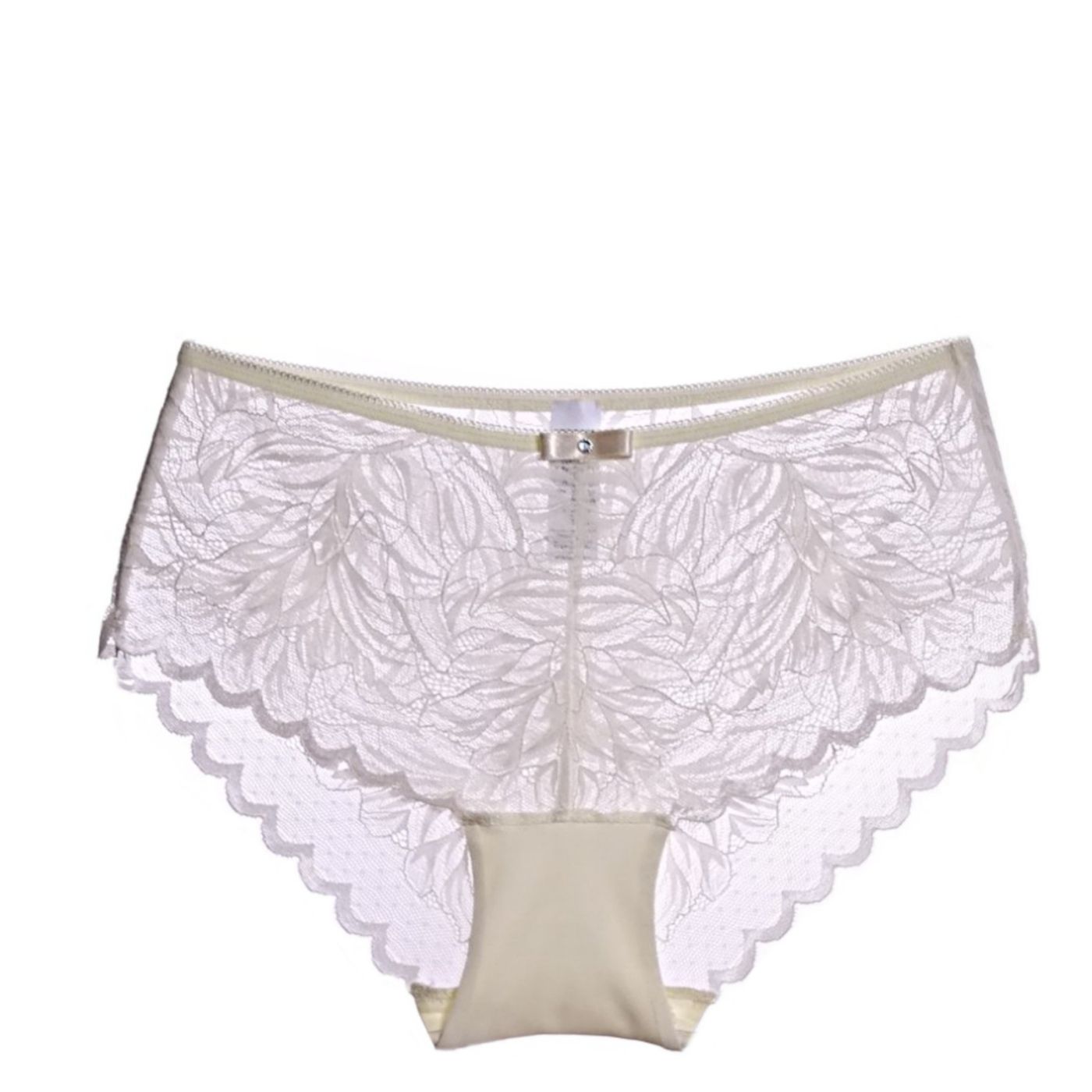 Luxury women's lace bikini in champagne color. The model has a high waist,