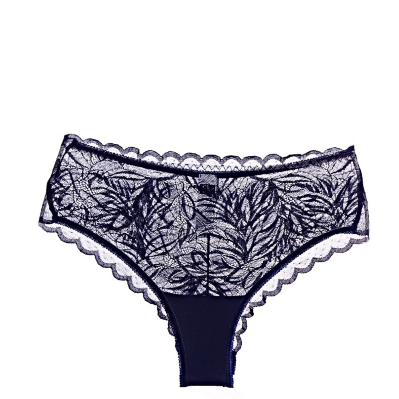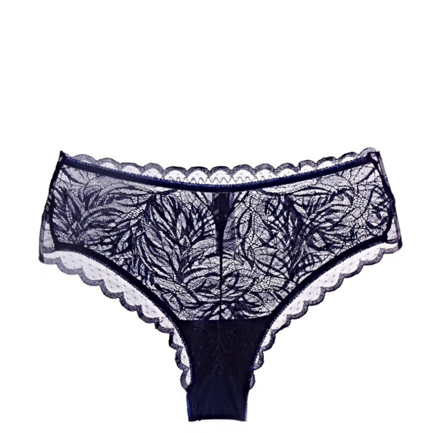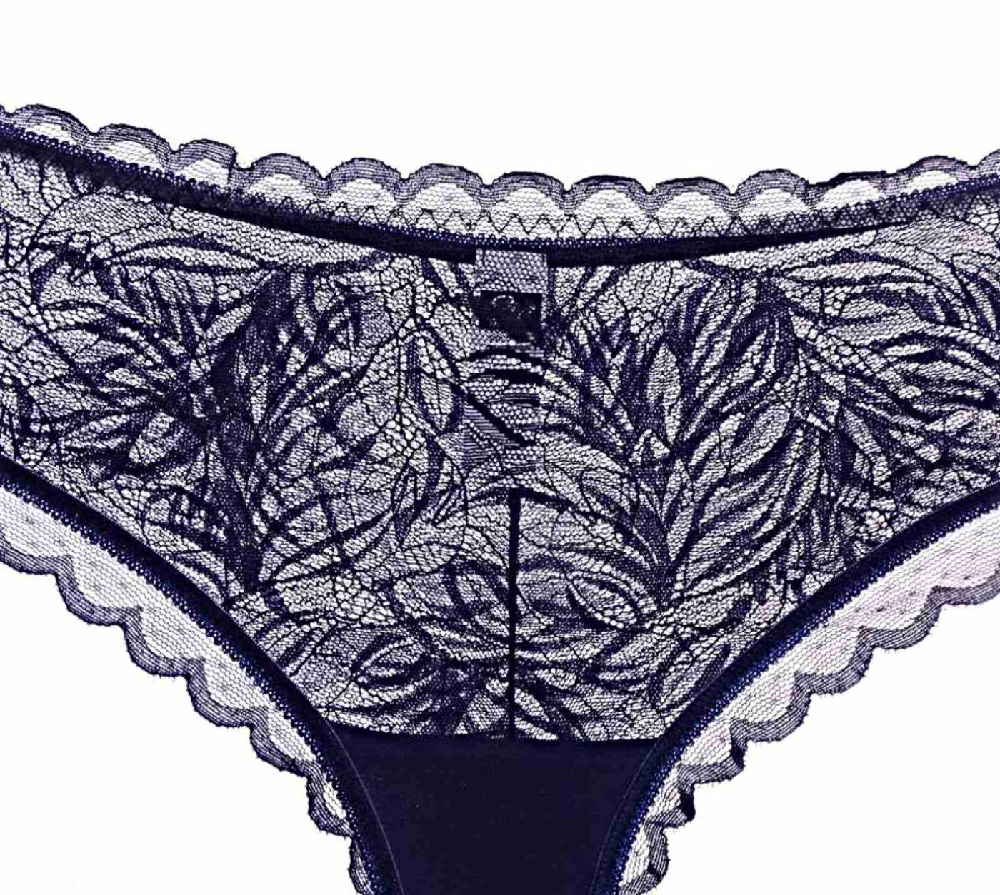 Luxurious women's Brazilian in dark blue color. The model has a high waist, is made of fine, elastic lace with a very beautiful design and is reinforced at the waist with silicone tape for greater comfort. Wear with pleasure in everyday life.