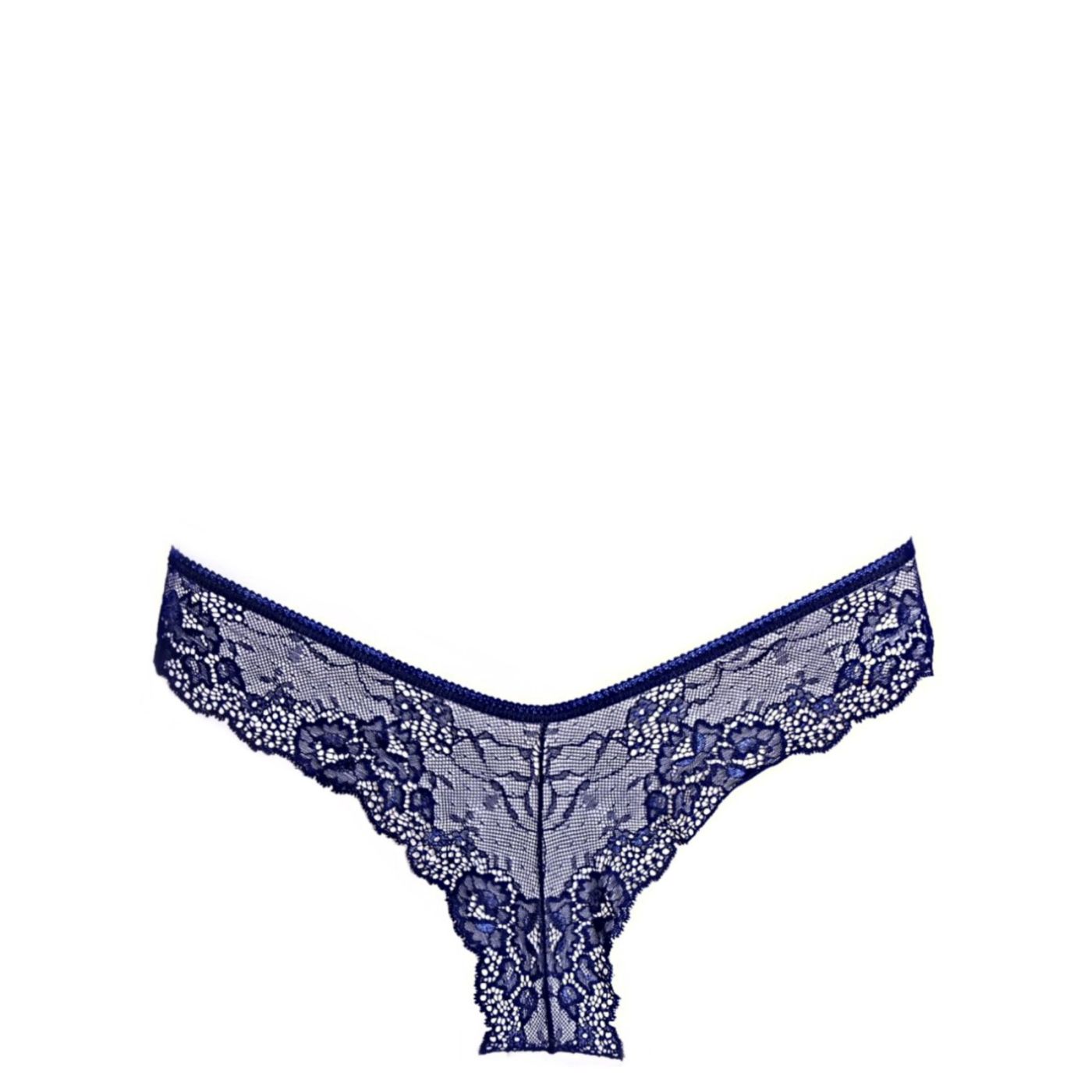 Elegant women's Brazilian in dark blue color. The pattern is medium deep, made entirely of fine, elastic lace with beautiful floral motifs. The Brazilian has interesting cuts in her front and that makes her look different. It is decorated with two satin ribbons in the same color.