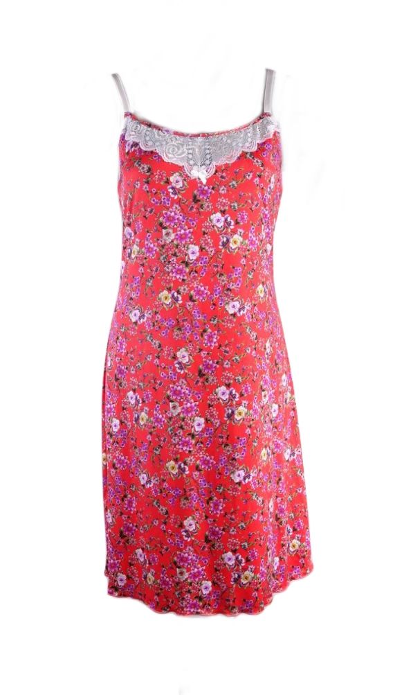Colorful women's nightgown with thin straps with an elegant A silhouette. The model is made of extremely pleasant and gentle to the touch polyamide fabric with a beautiful floral print and fine lace details. The straps have length adjusters.
