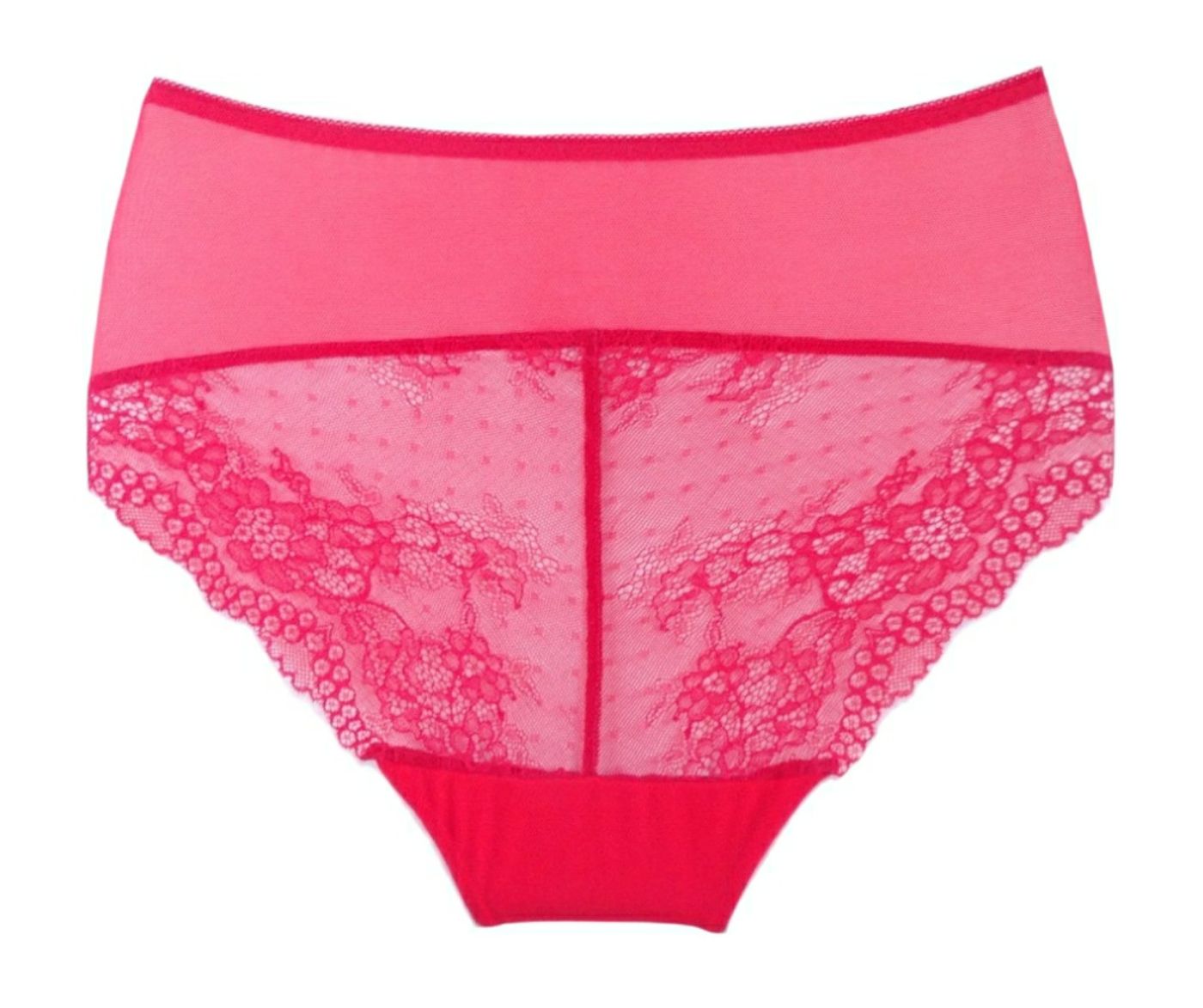 Luxurious women's bikini in fiery red color, made of delicate, elastic tulle and fine, beautiful lace. The model has a comfortable cut with a depth to the waist and is at the same time elegant and sexy.