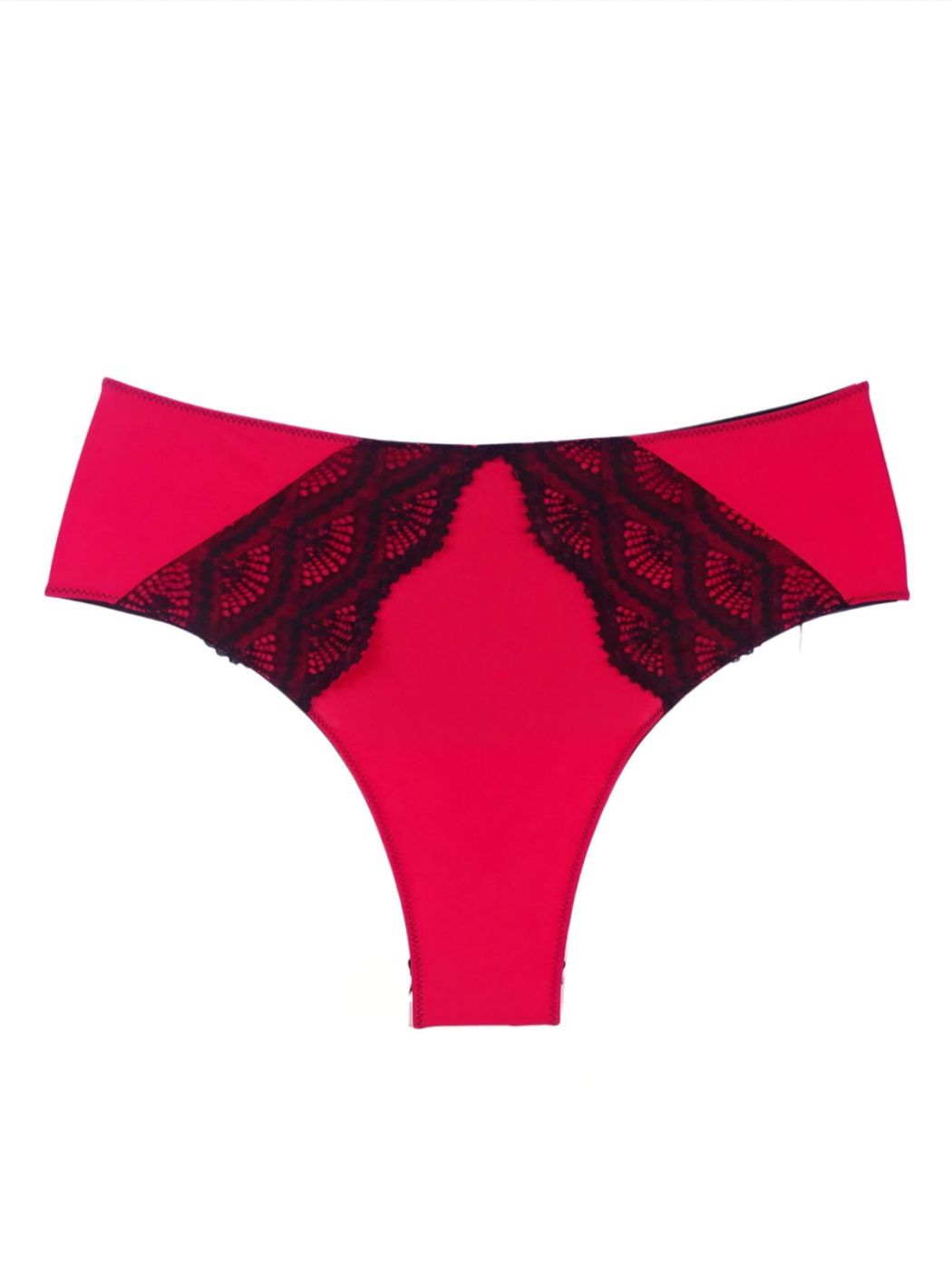 Luxury brazilian briefs made of highly elastic Italian microfiber in red color and quality black lace. The model has a comfortable cut with a medium depth and super fine elastic for maximum wearing comfort.