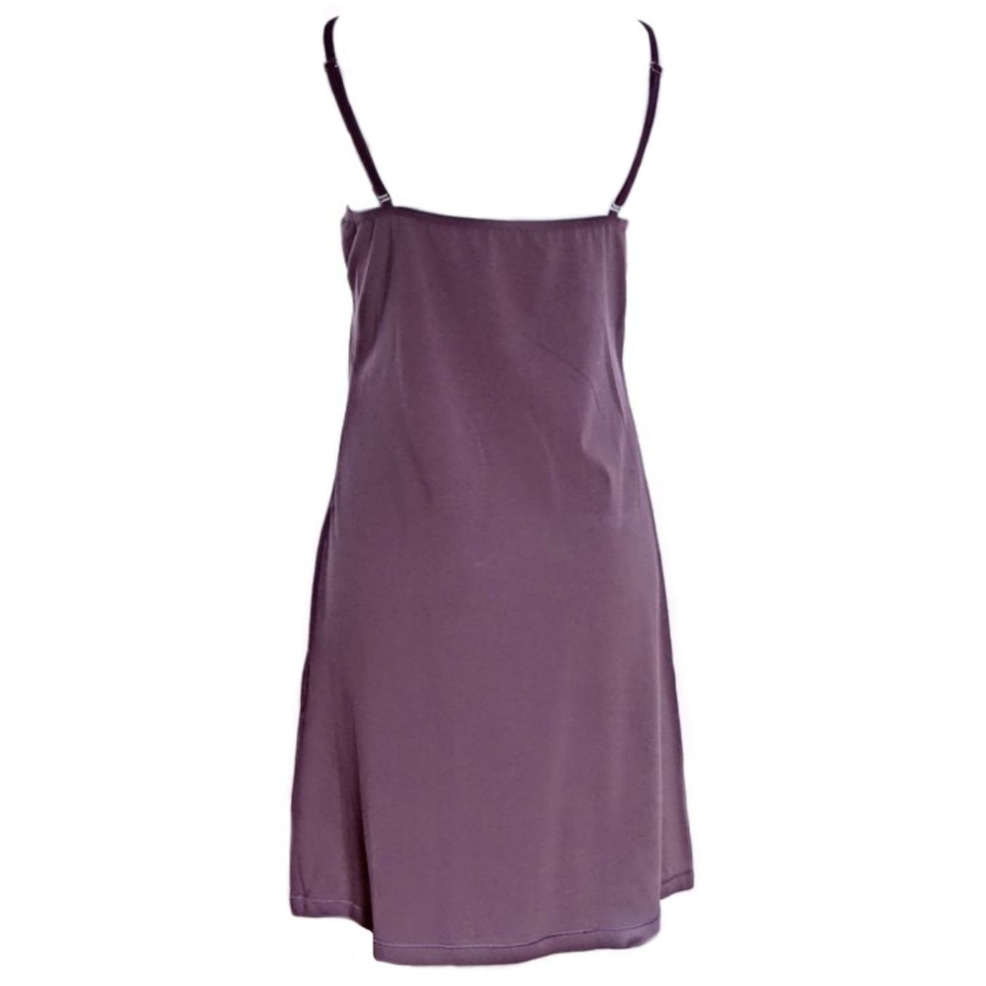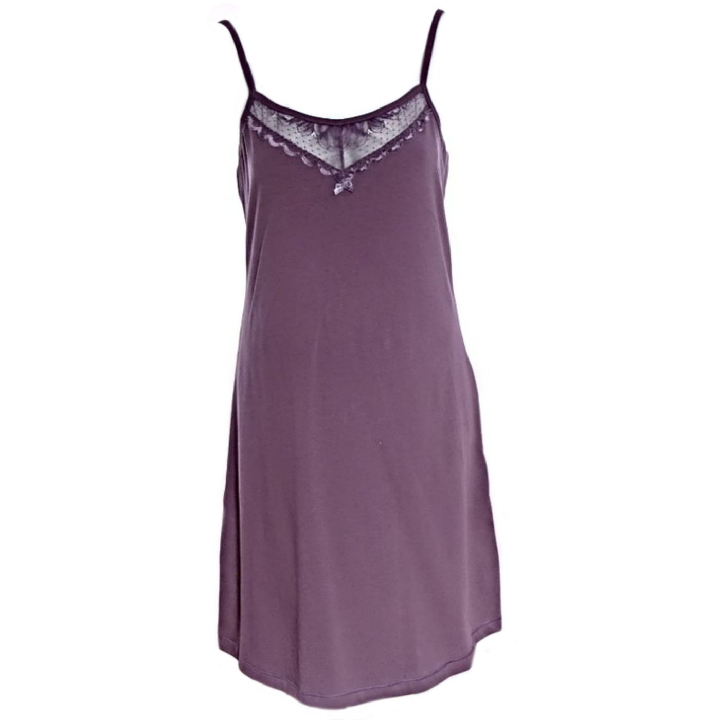 Дамска нощница от памук/еластан в цвят тъмна пепел. Моделът е дълъг до средата на бедрото, с А-линия и леко V-образно деколте с дантелен акцент. Нощницата е с тънки, регулиращи се презрамки за по-голямо удобство!