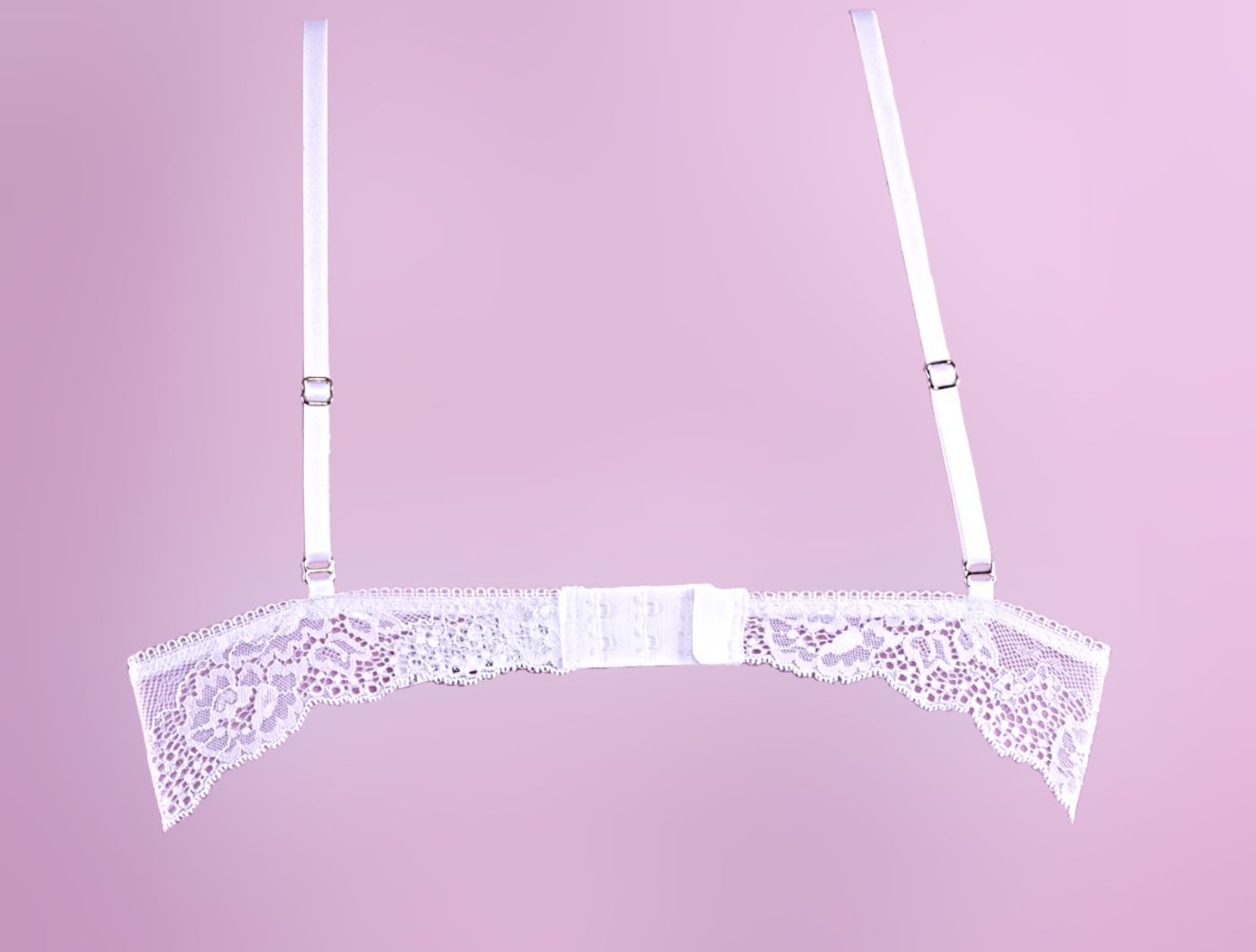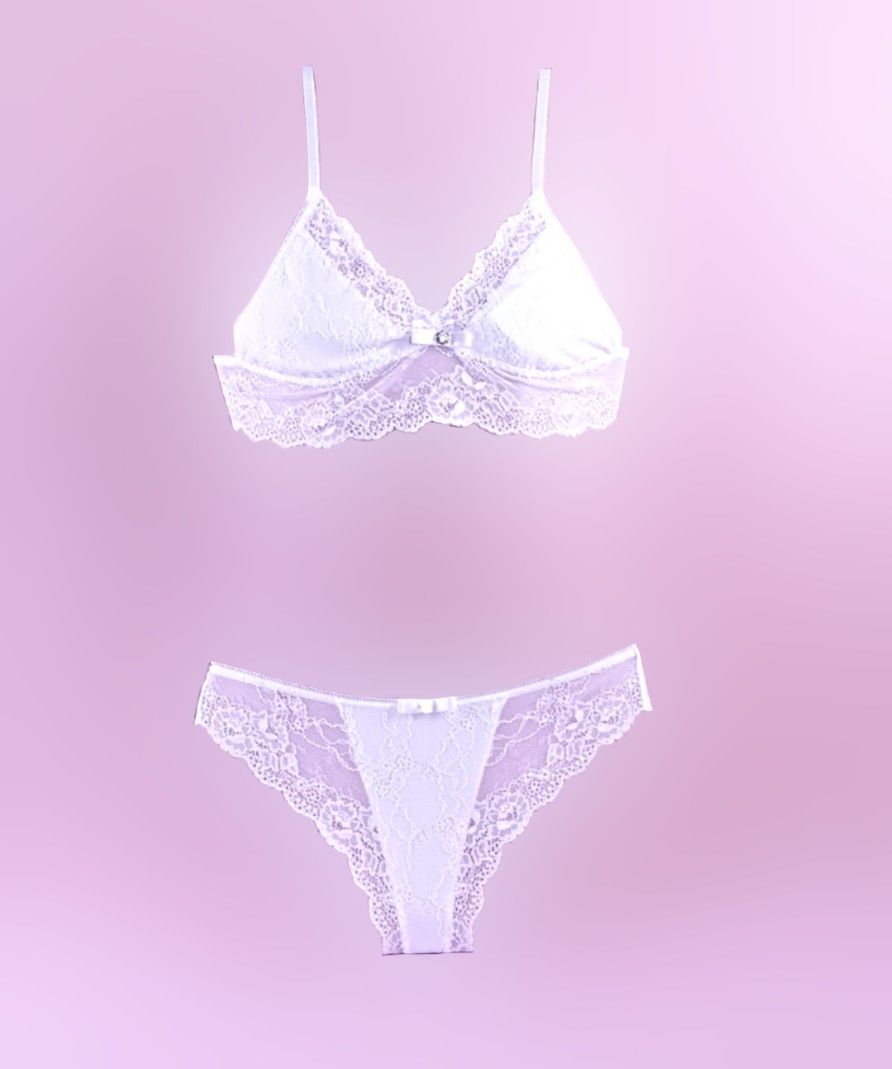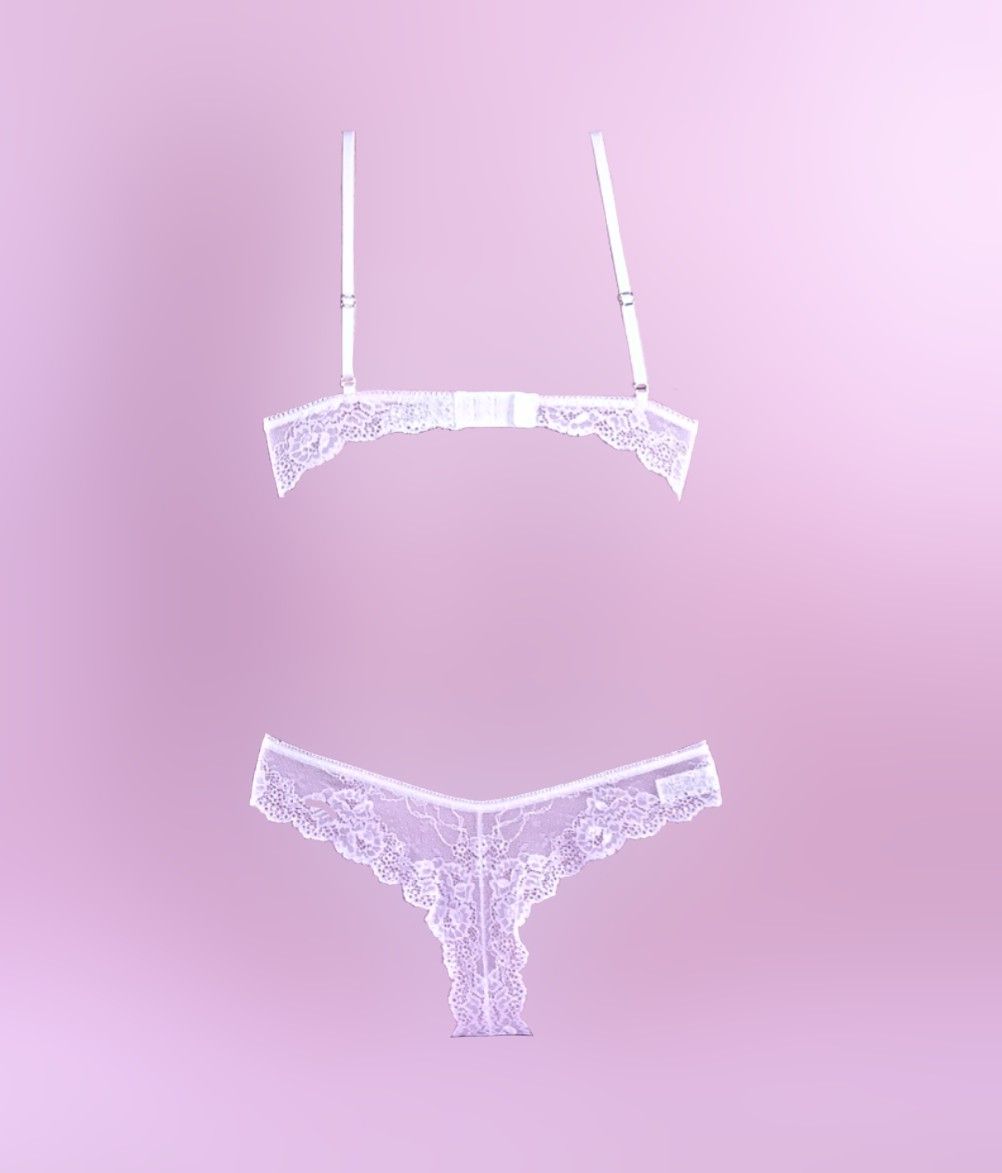Бъдете секси с този комплект бельо от две части в бяло. Бюстието е с мека чашка без банели, подплатено с памук и изработено от нежна дантела. Презрамките са регулиращи се за повече компфорт. Долната част също е изработена от дантела, като предницата е подплатена с бял памук. Елегантния завършек и в двете части е сатенена панделка с блестящ елемент в същия цвят! Идеален подарък за моминско парти!