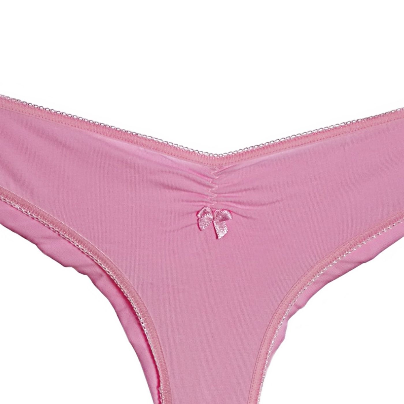 Удобна дамска памучна бразилиана в розов цвят. Моделът е с класическа кройка, предната част е с набор, завършен с панделка в същия цвят, а задната част е двойна и не позволява отбелязване под дрехите.