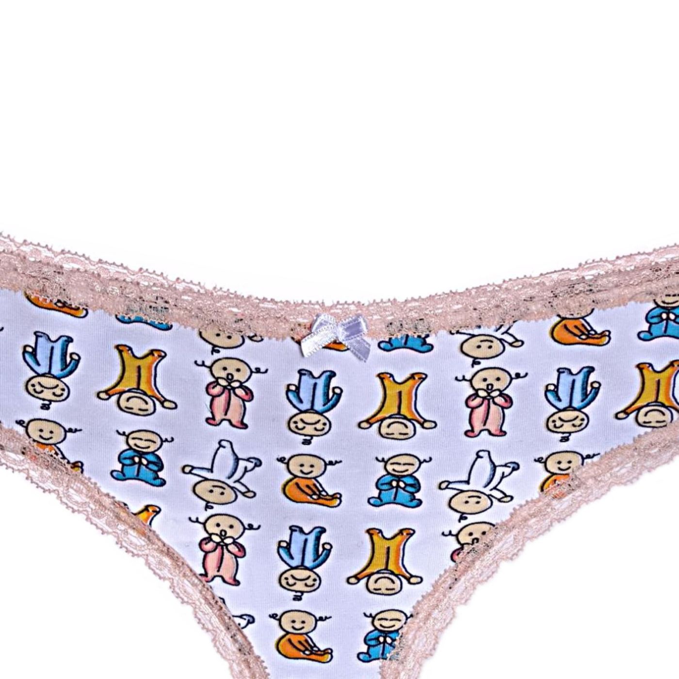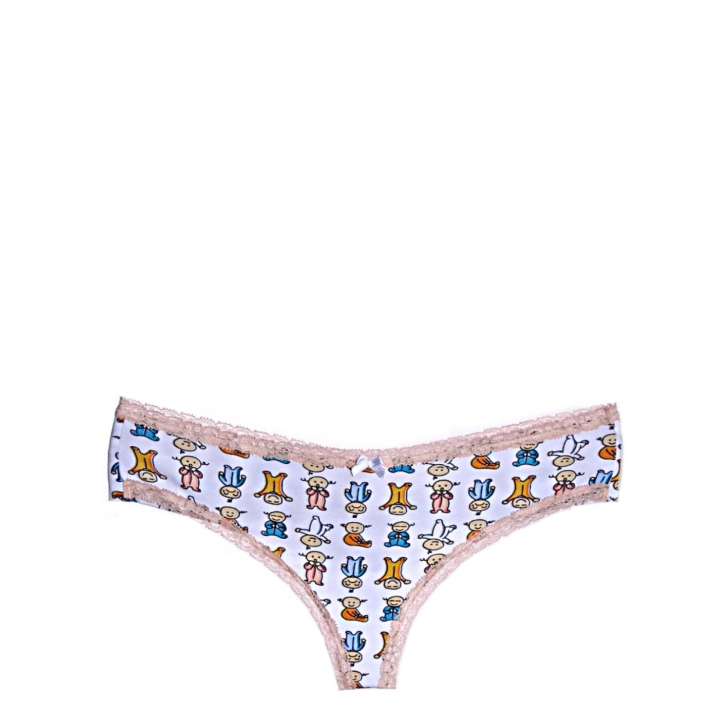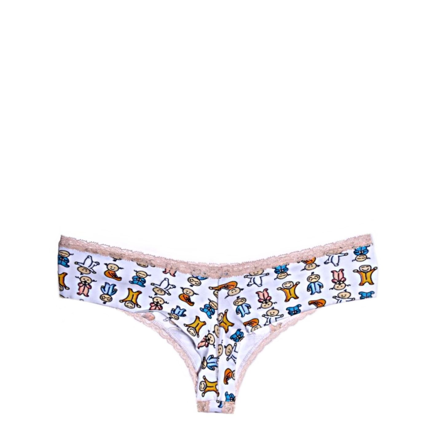 Дамска памучна бразилиана със закачлива щампа на човечета. Моделът е с класическа кройка, с дантелен банд по талията и крачолите, а задната част е двойна, за да не се отбелязва под дрехите.
