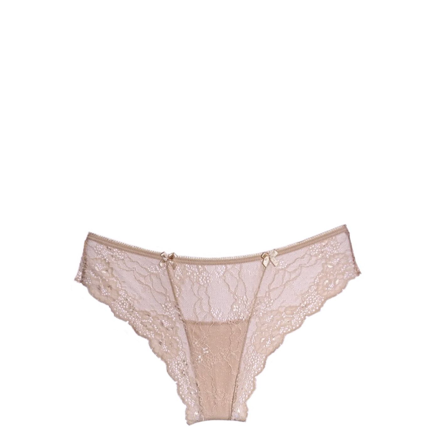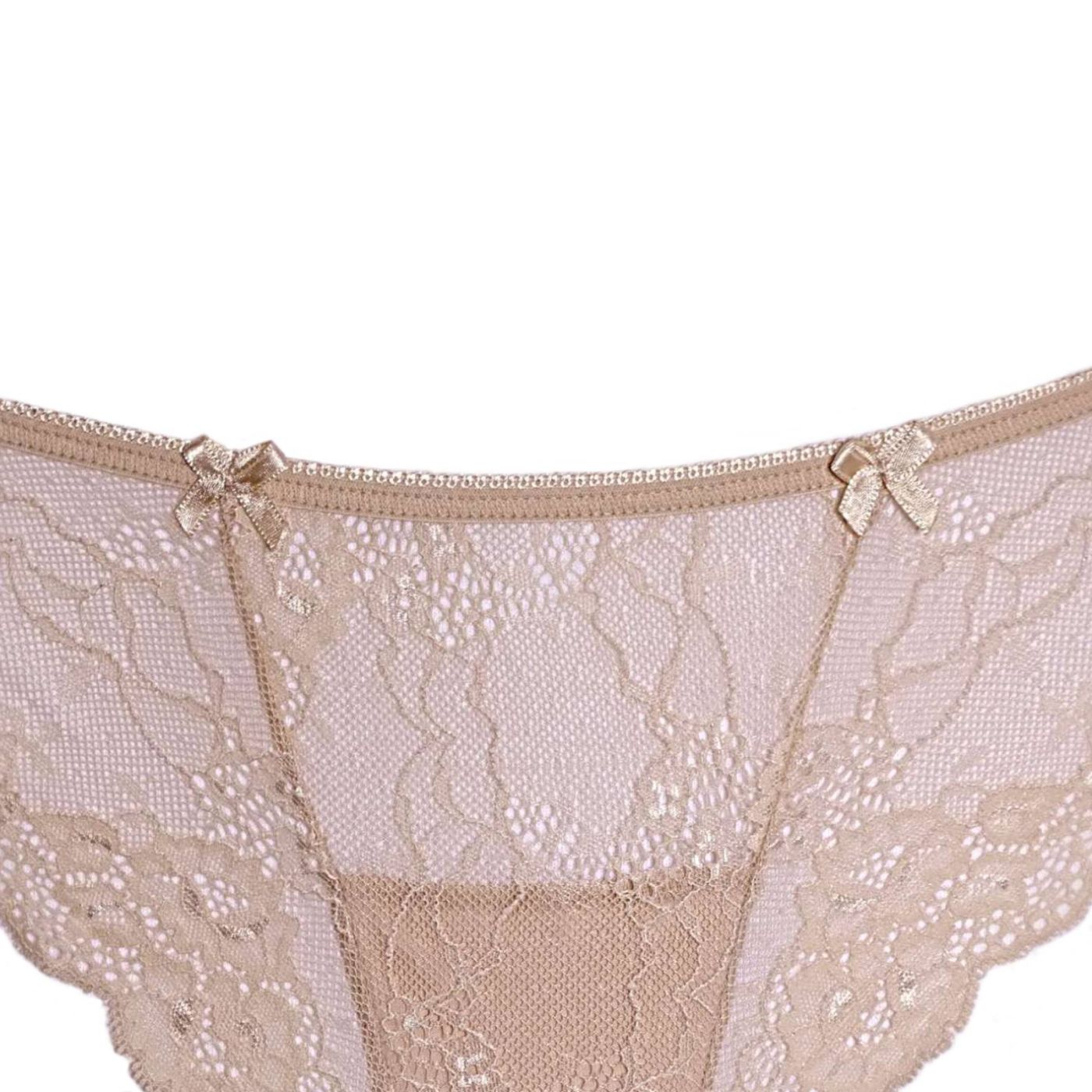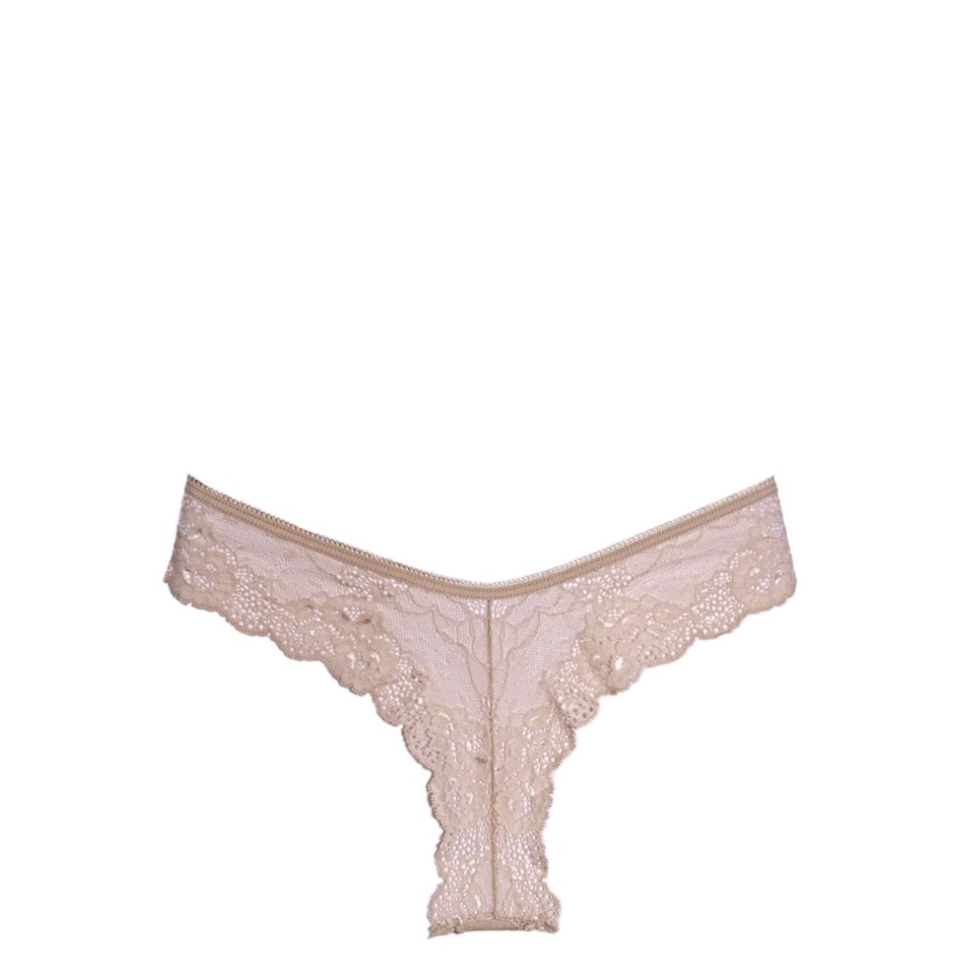 Луксозна дамска бразилиана в телесен цвят. Моделът е с интересна кройка, срязана отпред. Бразилианата е изпълнена изцяло от дантела и е изключително удобна. Завършена е с 2 малки сатенени панделки в същия цвят.