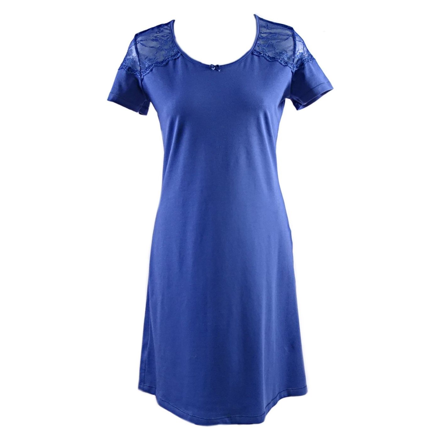 Дамска нощница от еластичен памук с дантелени акценти в горната част. Този модел е с обло деколте, с къси ръкави и дантелени акценти по тях. Кройката е свободна и е тип А-силует. Дължината е малко над коляното. Тази нощница е стилно допълнение към ежедневният Ви гардероб.