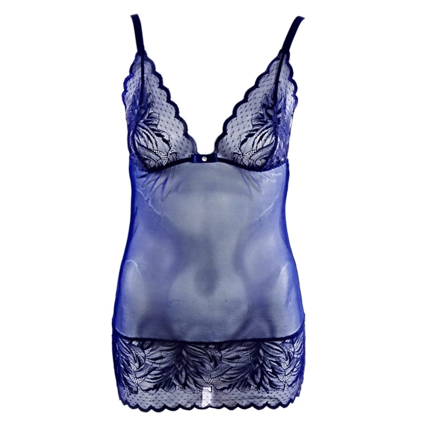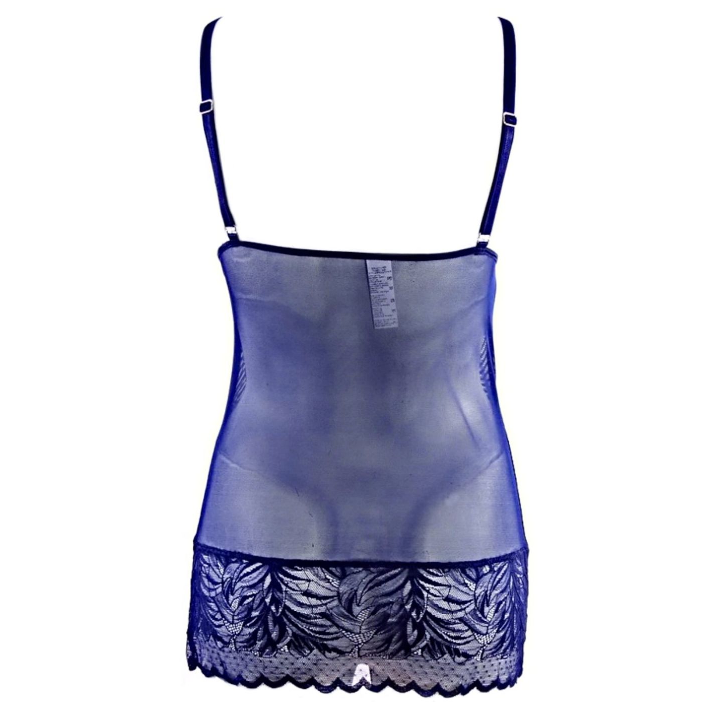 Елегантен дамски корсаж в тъмно син цвят. Моделът е изпълнен от нежен, еластичен тюл и фина дантела с красив дизайн по бюста и талията. Потникът е с тънки, регулиращи се презрамки за по-голямо удобство, с триъгълни чашки, които са изцяло от дантела и стоят страхотно. Визията е завършена със сатенена панделка и блестящи камъче.